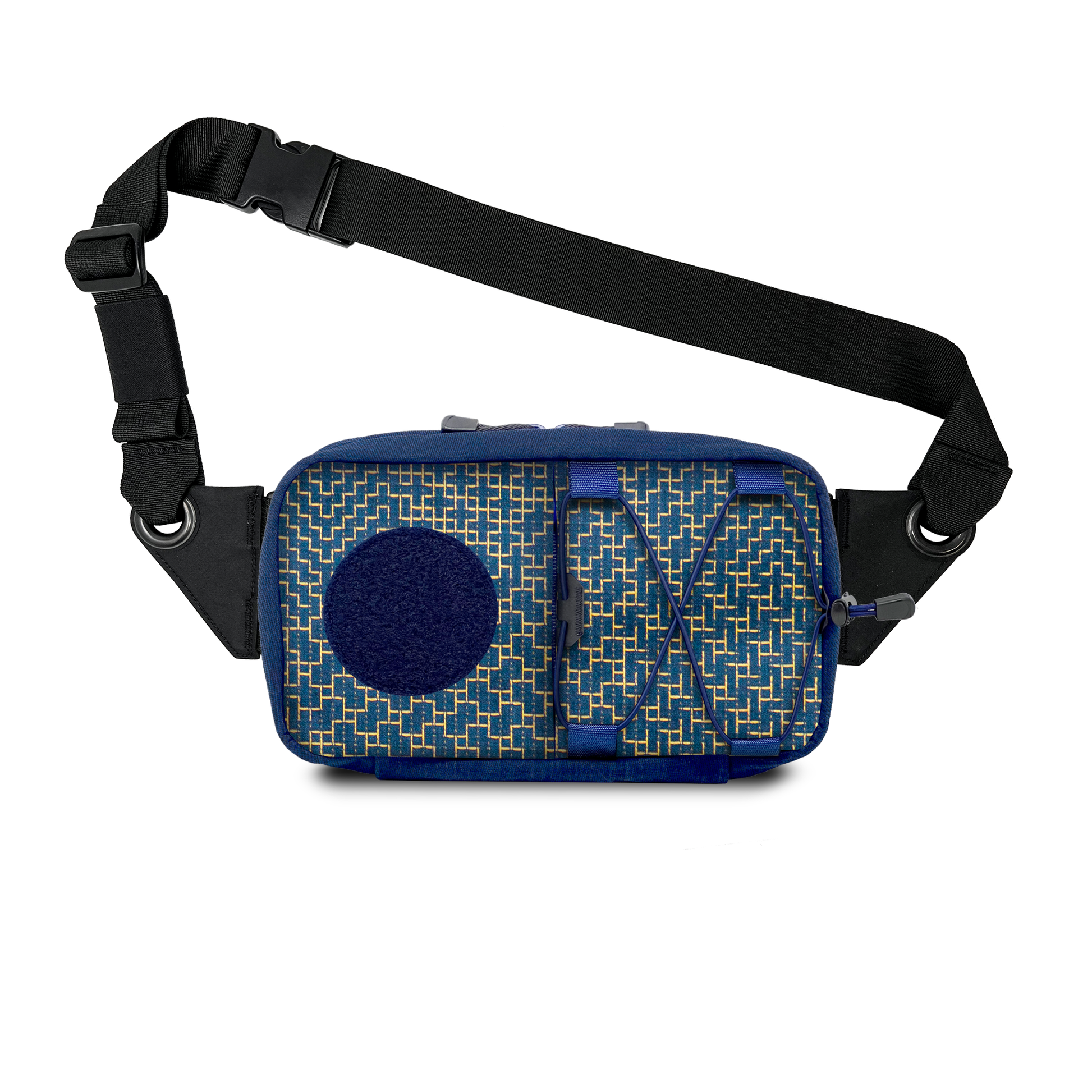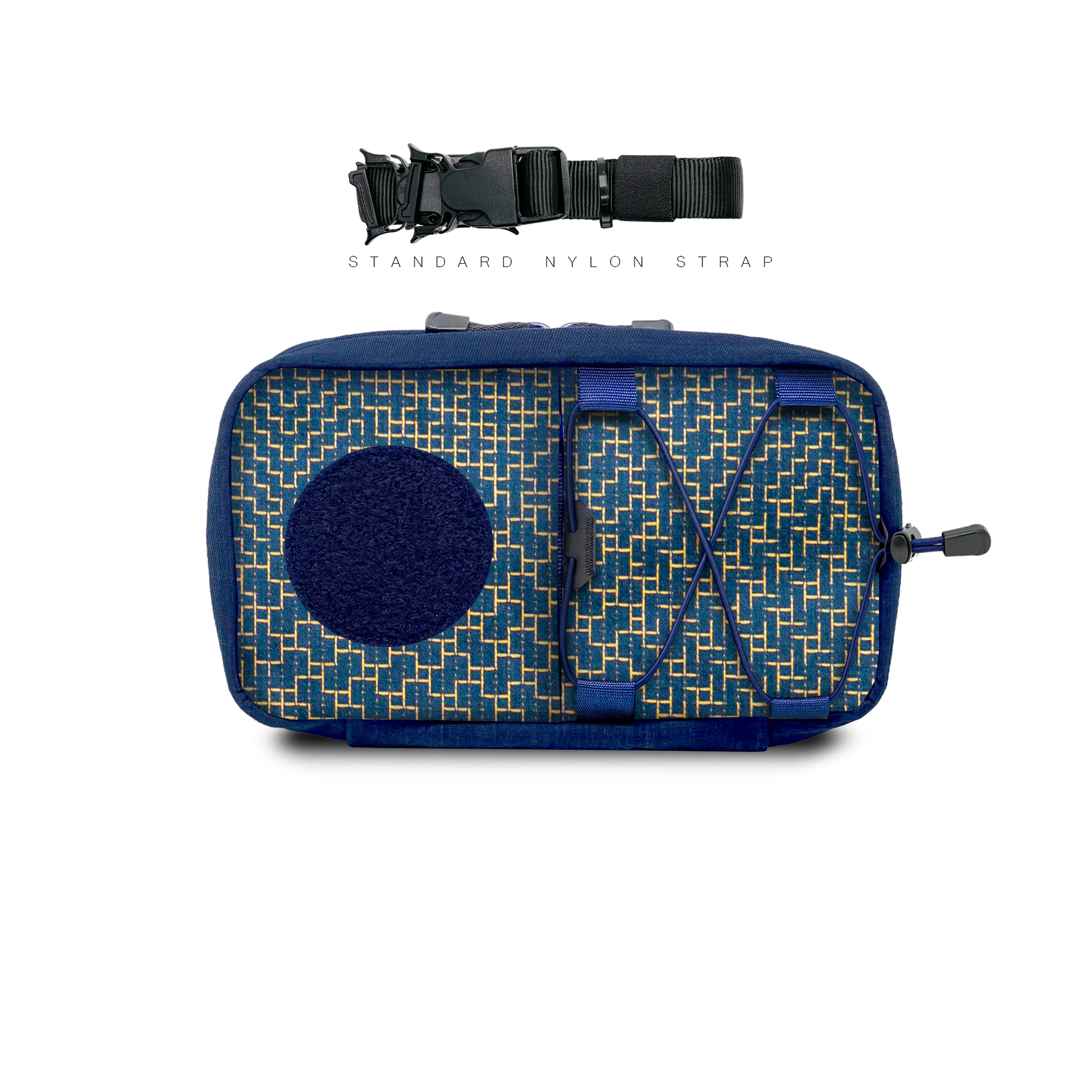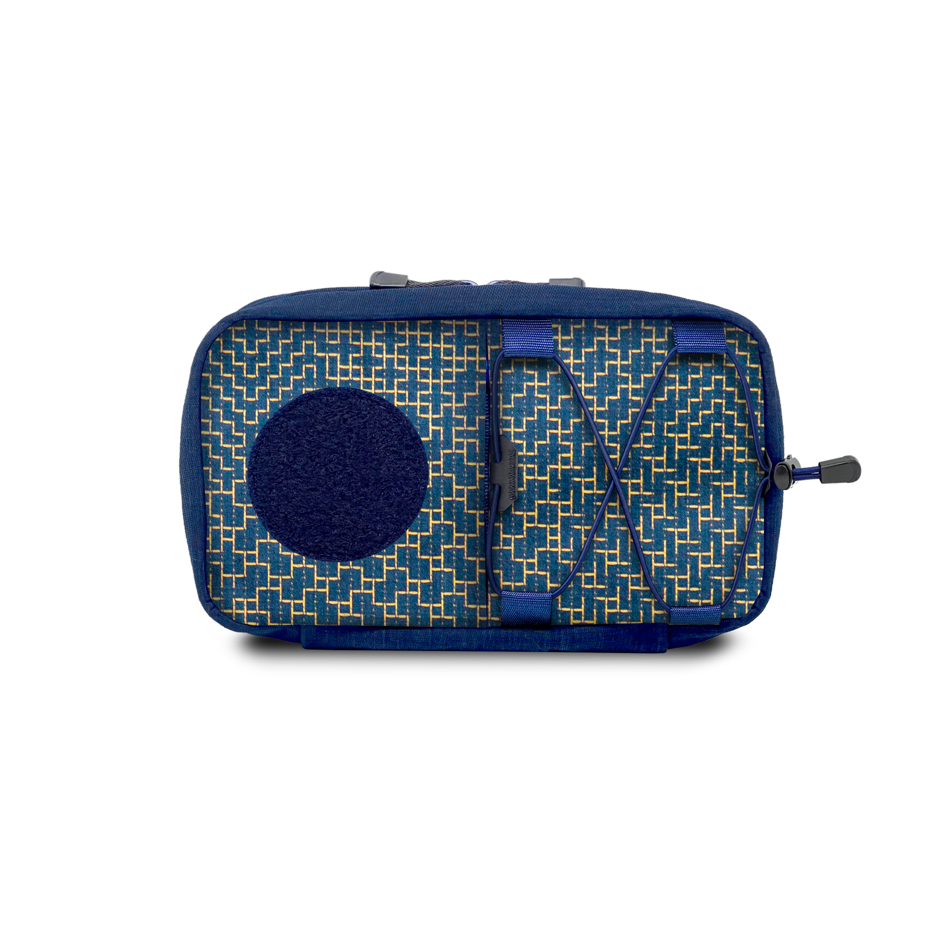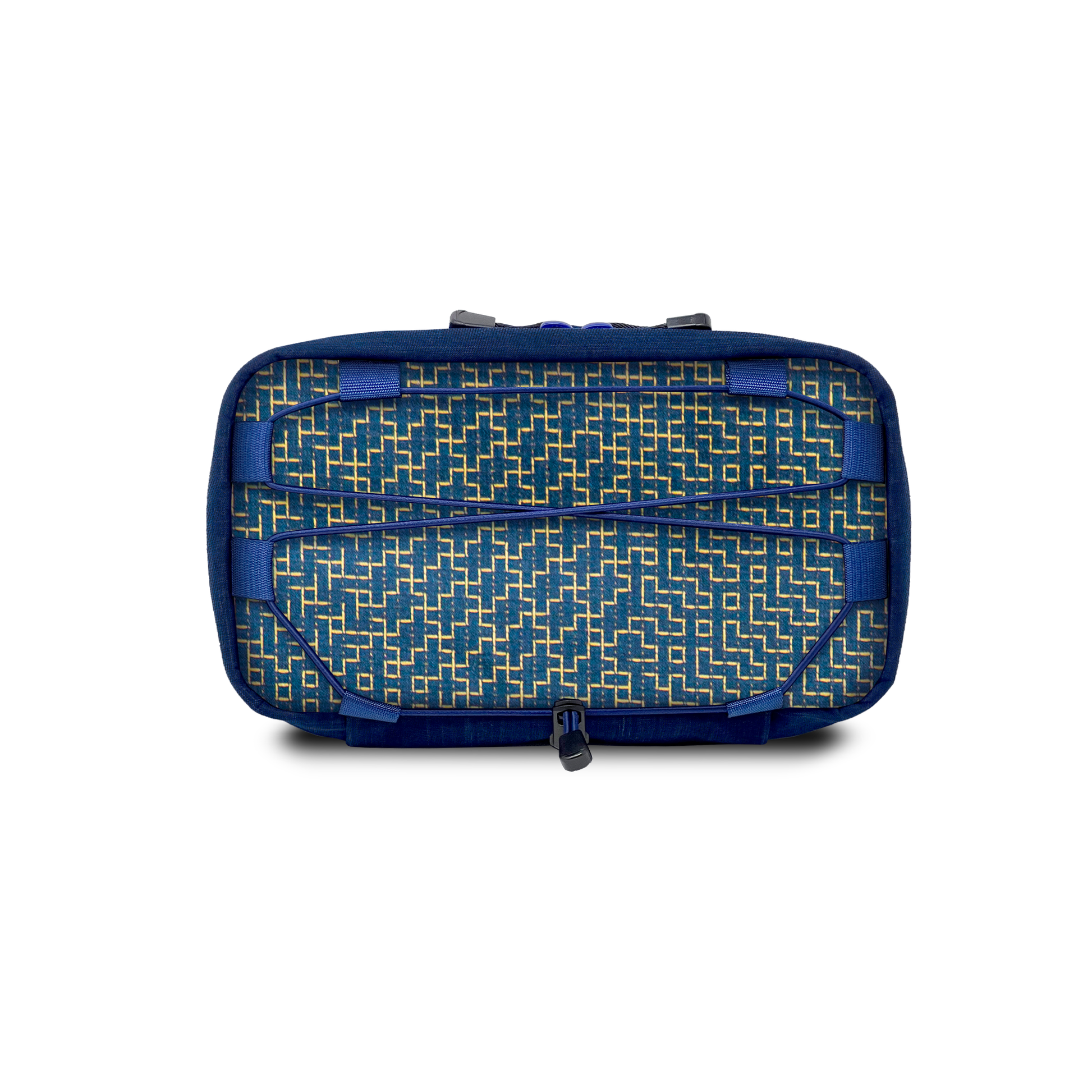 A hand-made modular organizer pouch with multiple carry options, made from vintage jacquard sashiko fabric with gold yard.